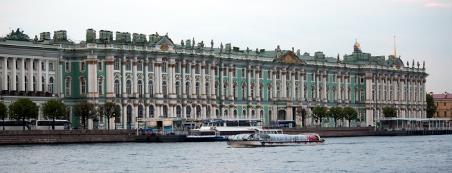 After dinner we took a boat through the canals of St. Petersburg. We encountered low bridges, had a lovely view of the Winter Palace, and after the lights finally came on in buildings at 10:30 at night, we still could see things very well, due to the white nights caused by the sun barely setting on the horizon. |